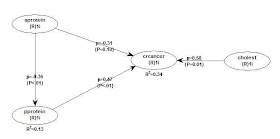 Below is the model with the results. (Click on it to enlarge. Use the "CRTL" and "+" keys to zoom in, and CRTL" and "-" to zoom out.) As in the previous post, the arrows explore associations between variables. The variables are shown within ovals. The meaning of each variable is the following: aprotein = animal protein consumption; pprotein = plant protein consumption; cholest = total cholesterol; crcancer = colorectal cancer.